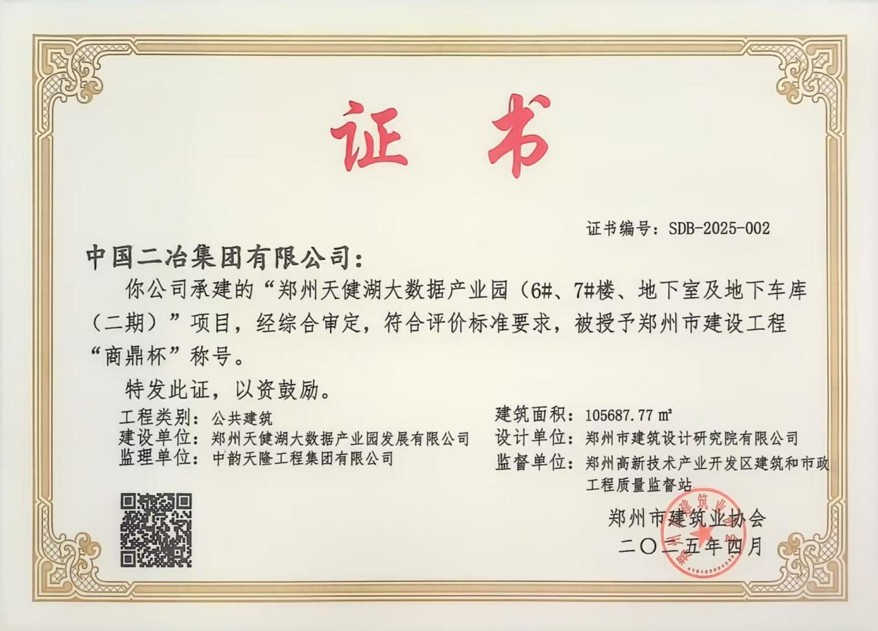 近日,鄭州市建筑業(yè)協(xié)會正式公布了2025年度鄭州市建設(shè)工程“商鼎杯”(市優(yōu)質(zhì)工程)獲獎名單,中國二冶鄭州天健湖大數(shù)據(jù)產(chǎn)業(yè)園6#、7#樓、地下室及地下車庫(二期)被授予鄭州市建設(shè)工程“商鼎杯”榮譽獎項。