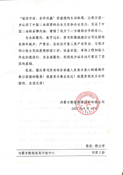 4月19日,內蒙古默銳能源材料有限公司向中國二冶發(fā)來感謝信,對在合作過程中所見證的中國二冶作為央企的實力擔當,以及用實際行動踐行的“一天也不耽誤,一天也不懈怠”的企業(yè)精神給予高度贊揚;對城建分公司領導給予該工程的高度重視、大力支持表示衷心感謝;對承擔該工程建設任務的達旗項目部全體工作人員以優(yōu)秀的專業(yè)素質和過硬的技術水平,保證項目的順利進行給予充分肯定和高度贊揚。