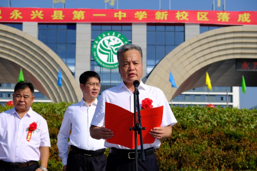 劉朝暉在致辭中首先代表縣委、縣人大、縣政府、縣政協(xié),向夜以繼日奮戰(zhàn)的中國二冶施工人員、項目指揮部工作人員和承建單位表示衷心感謝!廣大建設者克服了重重困難,歷經(jīng)了千辛萬苦,全體參與項目建設的同志們發(fā)揚“三牛”精神,吃苦耐勞,攻堅克難,奮戰(zhàn)1300多個日日夜夜,終于建成了一座占地400畝、學位6000個的現(xiàn)代化新高中,向全縣人民兌現(xiàn)了莊嚴承諾,也讓70萬永興人民充分感受到縣委縣政府致力于改善民本民生的堅定決心。他強調(diào),優(yōu)質(zhì)教育質(zhì)量的均衡發(fā)展一直是困擾當?shù)乜h鄉(xiāng)兩級教育事業(yè)發(fā)展的一個難題。今天新校區(qū)的揭牌意味著永興一中即將揚帆遠航,永興一中要以揭牌和開學為新起點,瞄準高標準,高質(zhì)量,高品位目標,提高教育質(zhì)量,辦出教育品牌,努力把學校創(chuàng)辦成管理一流,特色鮮明的義務教育標桿學校。