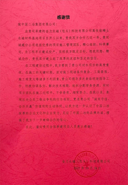 11月4日,在項目開工建設(shè)一周年之際,金力永磁(包頭)科技有限公司向中國二冶集團發(fā)來一封沉甸甸的感謝信,對中國二冶金力永磁項目部參建人員良好的工作作風(fēng)和嚴謹?shù)墓ぷ鲬B(tài)度表示感謝由衷。