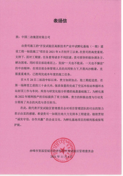 11月12日,中國二冶集團(tuán)赤峰市開發(fā)試驗(yàn)區(qū)高新技術(shù)產(chǎn)業(yè)中試孵化基地(一期)建設(shè)工程一標(biāo)段施工項(xiàng)目收到來自赤峰市資源型城市經(jīng)濟(jì)轉(zhuǎn)型開發(fā)試驗(yàn)區(qū)管理委員會發(fā)來的表揚(yáng)信,對中國二冶的大力支持、精心部署和項(xiàng)目團(tuán)隊(duì)在施工過程中表現(xiàn)出的良好敬業(yè)精神、專業(yè)的技術(shù)能力、攻堅(jiān)克難的實(shí)干精神及“用戶至上”的契約精神給予了高度肯定和贊揚(yáng)。