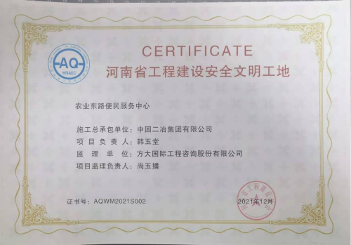 1月23日,從河南省工程建設(shè)協(xié)會(huì)傳來(lái)喜訊,中國(guó)二冶承建的河南鄭州農(nóng)業(yè)東路便民服務(wù)中心項(xiàng)目榮獲河南省2021年度“工程建設(shè)安全文明工地”稱號(hào)。