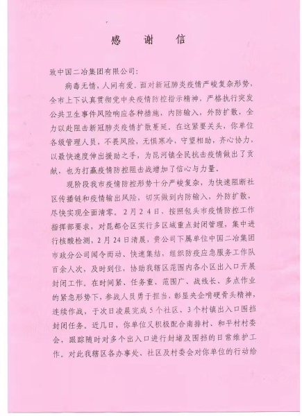 3月2日,昆河鎮(zhèn)人民政府向中國二冶發(fā)來感謝信,對(duì)中國二冶在全市全力阻擊新冠肺炎疫情擴(kuò)散蔓延的緊要關(guān)頭,不畏風(fēng)險(xiǎn),無懼寒冷,守望相助,齊心協(xié)力,以最快速度為昆河鎮(zhèn)快速阻斷社區(qū)傳播鏈和疫情輸出風(fēng)險(xiǎn)所做出的貢獻(xiàn),對(duì)央企快速反應(yīng)、雷厲風(fēng)行的工作作風(fēng)表示感謝。