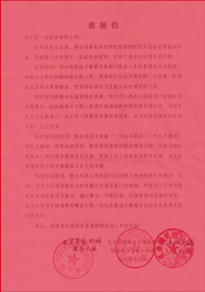 6月8日,甘肅省隴南市禮縣縣委協(xié)調(diào)領(lǐng)導(dǎo)小組辦公室、禮縣新冠肺炎疫情聯(lián)防聯(lián)控領(lǐng)導(dǎo)小組辦公室、禮縣城關(guān)鎮(zhèn)人民政府致中國二冶表揚(yáng)信,對中國二冶景禮高速公路項(xiàng)目部扎根一線,把疫情防控作為當(dāng)前首要政治任務(wù),用實(shí)際行動詮釋央企的責(zé)任和擔(dān)當(dāng)表示感謝。