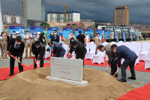 蒙方項目管理機(jī)構(gòu)主要領(lǐng)導(dǎo)宣布中國援助蒙古國棚戶區(qū)改造項目正式啟動。蒙古國相關(guān)領(lǐng)導(dǎo)在禮儀人員的引導(dǎo)下來到奠基石前為工程開工培土奠基,開工儀式順利完成。