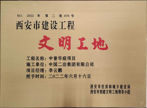 7月5日,中國(guó)二冶收到西安市住房和城鄉(xiāng)建設(shè)局頒發(fā)的榮譽(yù)證書(shū)及獎(jiǎng)牌,由中國(guó)二冶承建的中譽(yù)華庭項(xiàng)目榮獲西安市“文明工地”榮譽(yù)稱號(hào)。