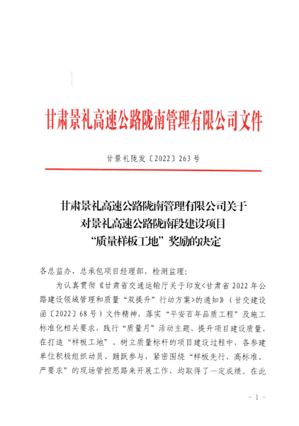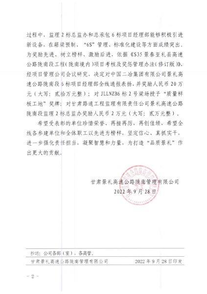 9月28日,甘肅景禮高速公路隴南管理有限公司發(fā)布通報,對中國二冶甘肅分公司景禮項(xiàng)目部在“質(zhì)量樣板工地”評比中獲得優(yōu)異成績進(jìn)行通報表揚(yáng),景禮項(xiàng)目部二號梁場榮獲“質(zhì)量樣板工地”獎牌,并給予20萬元嘉獎。