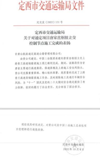 10月21日,中國二冶通定高速項(xiàng)目部收到來自定西市交通運(yùn)輸局的表揚(yáng)信,對中國二冶通定高速項(xiàng)目部管理團(tuán)隊(duì)按時完成節(jié)點(diǎn)目標(biāo)表示高度肯定。