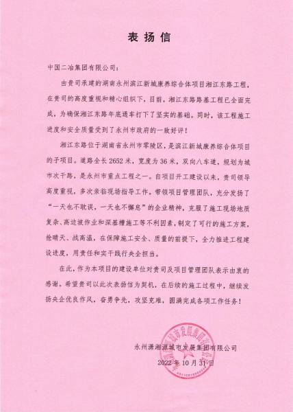 10月31日,中國(guó)二冶濱江新城康養(yǎng)綜合體項(xiàng)目收到來(lái)自永州瀟湘源城市發(fā)展集團(tuán)有限公司的表?yè)P(yáng)信,對(duì)中國(guó)二冶濱江新城康養(yǎng)綜合體項(xiàng)目部管理團(tuán)隊(duì)按時(shí)完成湘江東路路基建設(shè)表示高度贊揚(yáng)。