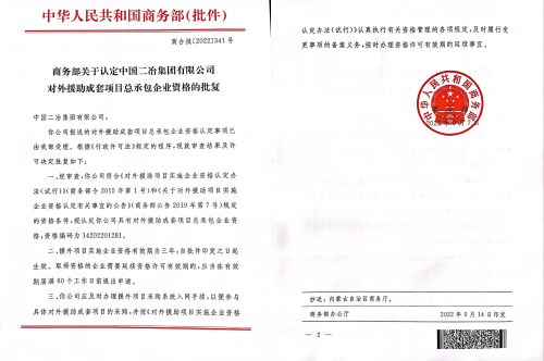 對(duì)外援助成套項(xiàng)目實(shí)施企業(yè)資格是企業(yè)“走出去”的一張重要名片。2015年,商務(wù)部頒發(fā)了《對(duì)外援助成套項(xiàng)目管理辦法(試行)》,對(duì)所有企業(yè)援外資格重新認(rèn)定,由過(guò)去全國(guó)348家援外成套A級(jí)資質(zhì)企業(yè)壓縮到70家之內(nèi)。在商務(wù)部調(diào)整對(duì)外援助管理制度下,2016年,中國(guó)二冶成功通過(guò)資格審批,首次獲批對(duì)外援助成套項(xiàng)目總承包企業(yè)資格(有效期三年)。中國(guó)二冶高度重視援外資質(zhì)的維護(hù)與管理,在資格許可有效期屆滿(mǎn)前,積極主動(dòng)與商務(wù)部相關(guān)主管部門(mén)聯(lián)系,建立良好的溝通渠道,密切跟進(jìn)資格延續(xù)進(jìn)展,2019年,首次資格延續(xù)審查工作順利通過(guò)。2022年,公司克服疫情等不利因素,按照商務(wù)部公告,年初,公司主要領(lǐng)導(dǎo)親自部署、統(tǒng)籌協(xié)調(diào),對(duì)申報(bào)工作做出明確指示。在自治區(qū)商務(wù)廳、包頭市商務(wù)局、中國(guó)中冶海外工程和礦業(yè)管理部的大力支持下,按照商務(wù)部頒發(fā)的《對(duì)外援助成套項(xiàng)目實(shí)施企業(yè)資格認(rèn)定辦法》提前謀劃、精心準(zhǔn)備申報(bào)資料。歷經(jīng)半年多時(shí)間,經(jīng)過(guò)內(nèi)蒙古自治區(qū)商務(wù)廳初審、復(fù)審,中華人民共和國(guó)商務(wù)部初審、復(fù)審,最終再次獲批對(duì)外援助成套項(xiàng)目總承包企業(yè)資格。