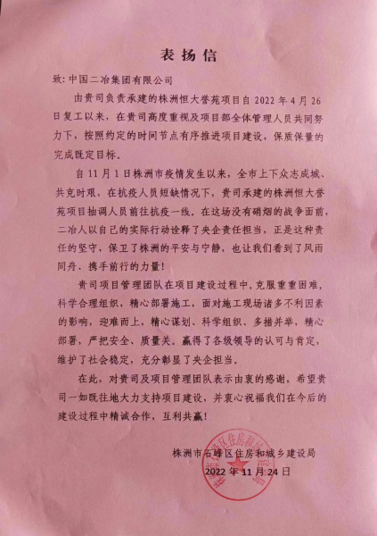 11月24日,中國二冶收到株洲市石峰區(qū)住房和城鄉(xiāng)建設局發(fā)來的表揚信,對中國二冶承建的株洲恒大譽苑項目自4月26日復工以來的項目管理舉措及突發(fā)疫情情況下的央企擔當表示肯定,對項目管理團隊表示贊揚。