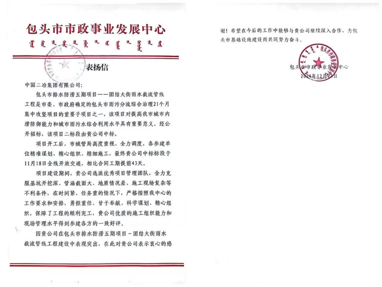 此次來信表揚,既是對項目管理團隊施工組織能力和現場管理水平的充分肯定,更是對中國二冶為包頭市基礎設施建設做出的杰出貢獻表示感謝。包頭市市政事業(yè)發(fā)展中心表示,期望雙方在今后能繼續(xù)深入合作,共同為包頭市的城市建設發(fā)展貢獻力量。