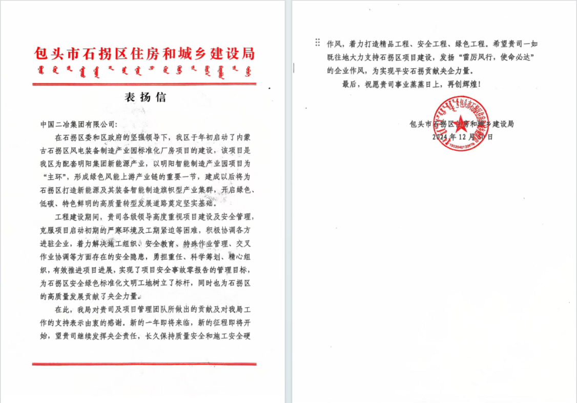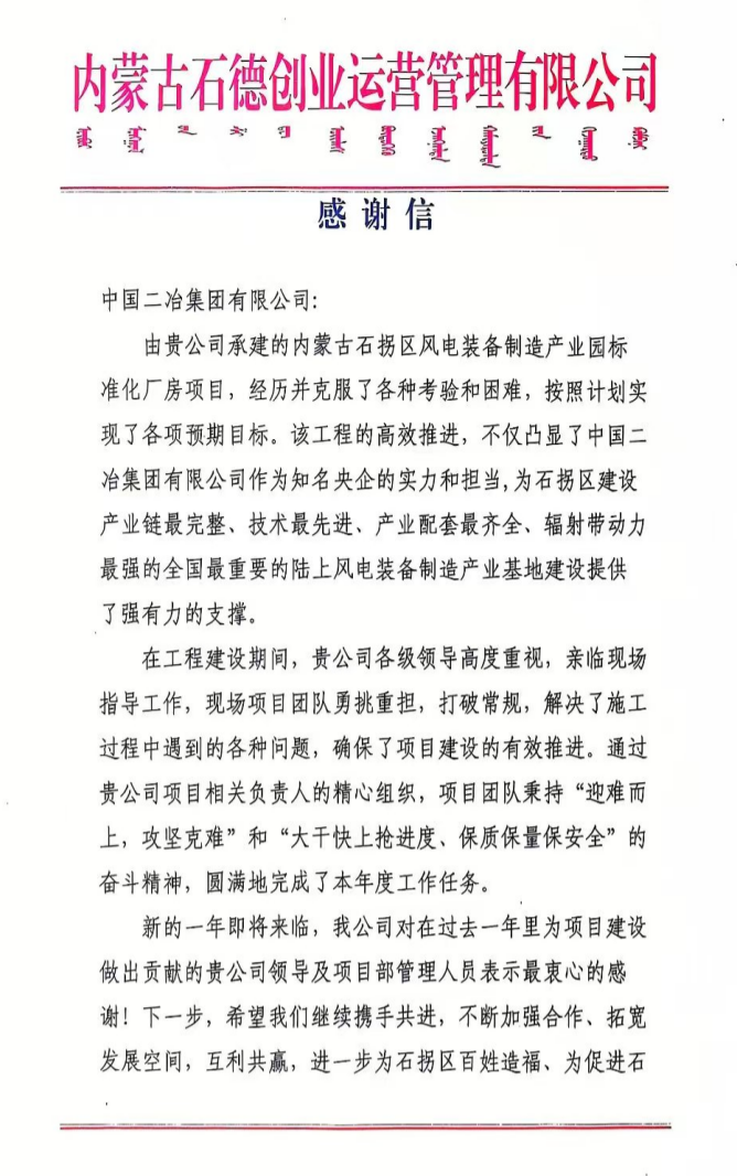 石拐區(qū)住建局在信中指出,內(nèi)蒙古石拐區(qū)風(fēng)電裝備制造產(chǎn)業(yè)園標(biāo)準(zhǔn)化廠房項(xiàng)目是石拐區(qū)為配套明陽(yáng)集團(tuán)新能源產(chǎn)業(yè)形成綠色風(fēng)能上游產(chǎn)業(yè)鏈的重要項(xiàng)目,在工程建設(shè)期間,中國(guó)二冶各級(jí)領(lǐng)導(dǎo)高度重視項(xiàng)目建設(shè),項(xiàng)目管理克服項(xiàng)目啟動(dòng)初期的嚴(yán)寒環(huán)境及工期緊迫等困難,勇?lián)厝?、科學(xué)籌劃、精心組織,有效推進(jìn)項(xiàng)目進(jìn)展,為石拐區(qū)的高質(zhì)量發(fā)展貢獻(xiàn)了央企力量。