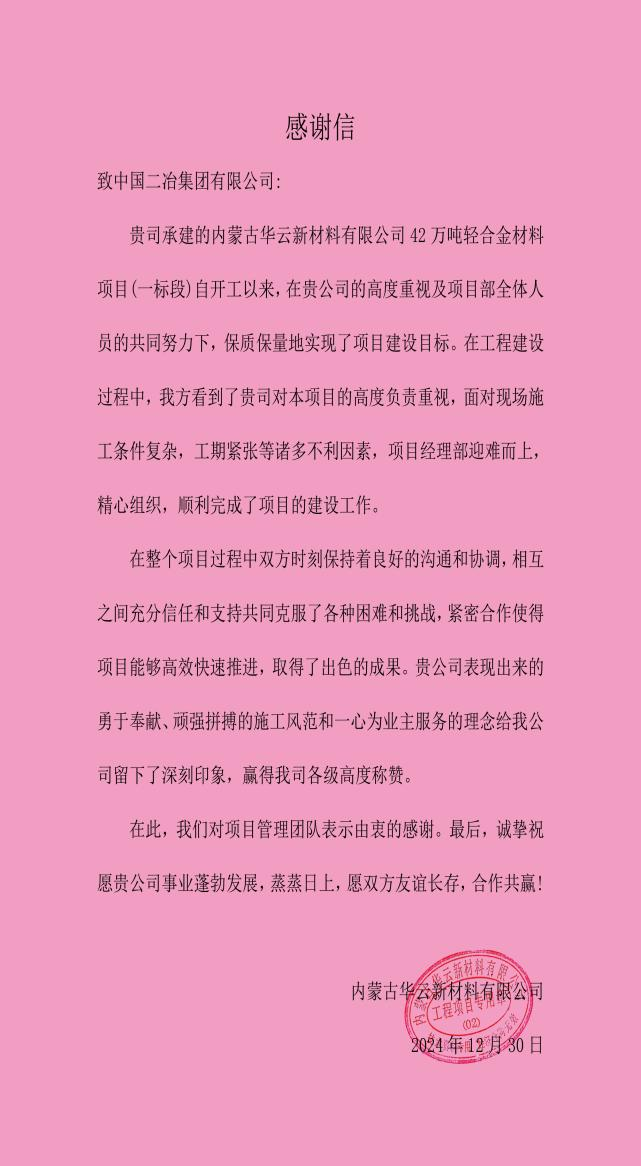 內(nèi)蒙古華云新材料有限公司在表?yè)P(yáng)信中指出,由中國(guó)二冶承建的內(nèi)蒙古華云三期42萬噸輕合金材料項(xiàng)目,在貴公司的高度重視及項(xiàng)目部全體人員的共同努力下,保質(zhì)保量地實(shí)現(xiàn)了項(xiàng)目建設(shè)目標(biāo),贏得相關(guān)方的高度稱贊。