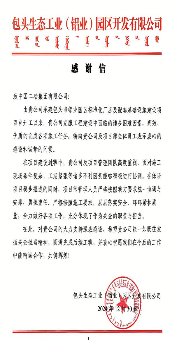 包頭市生態(tài)工業(yè)(鋁業(yè))園區(qū)開發(fā)有限公司在表?yè)P(yáng)信中指出,由貴公司承建包頭市鋁業(yè)園區(qū)一期標(biāo)準(zhǔn)化廠房及配套基礎(chǔ)設(shè)施建設(shè)項(xiàng)目自開工以來,貴公司克服工程建設(shè)中面臨的諸多困難因素,高效、優(yōu)質(zhì)地完成了各項(xiàng)施工任務(wù)。