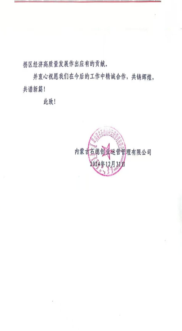 明陽(yáng)智慧能源集團(tuán)股份公司在感謝信中指出,2024年,貴司憑借專業(yè)的施工能力、嚴(yán)謹(jǐn)?shù)墓芾響B(tài)度以及卓越的團(tuán)隊(duì)協(xié)作精神,從明陽(yáng)智能制造產(chǎn)業(yè)園基地建設(shè),到蒙能投內(nèi)蒙古鄂爾多斯杭錦旗蒙能杭錦旗1600兆瓦項(xiàng)目建設(shè),再到包鋼(集團(tuán))白云鄂博礦區(qū)綠電直供項(xiàng)目建設(shè),圓滿完成了年度重要施工節(jié)點(diǎn)及交付任務(wù)。