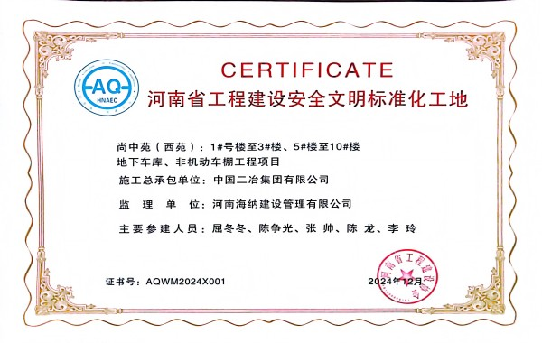 近日,由中國(guó)二冶承建的尚中苑(西苑)工程項(xiàng)目榮獲河南省工程建設(shè)協(xié)會(huì)“河南省工程建設(shè)安全文明標(biāo)準(zhǔn)化工地”榮譽(yù)稱(chēng)號(hào)。