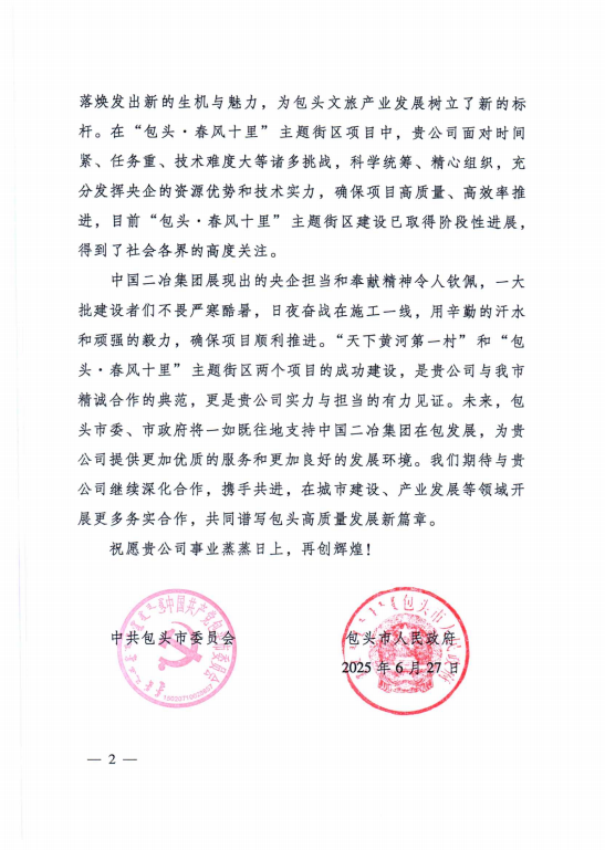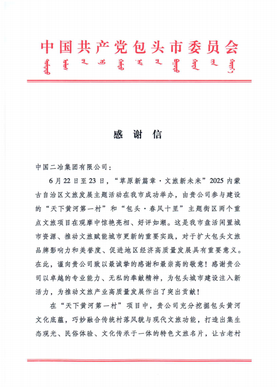 6月30日,中國(guó)二冶收到包頭市委、市政府發(fā)來的表揚(yáng)信,對(duì)中國(guó)二冶在“天下黃河第一村”和“包頭?春風(fēng)十里”兩大重點(diǎn)文旅項(xiàng)目建設(shè)中作出的卓越貢獻(xiàn),給予高度贊譽(yù)。?