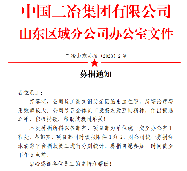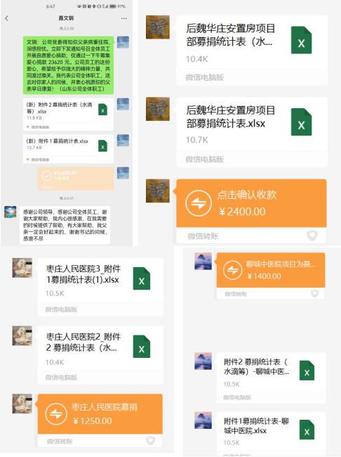 4月21日,在山東分公司工作群中,隨著一份募捐通知的下發(fā),機(jī)關(guān)各部門、各項(xiàng)目部干部員工紛紛行動(dòng),為分公司曹縣安置房項(xiàng)目員工聶文鋼的父親進(jìn)行愛心募捐。