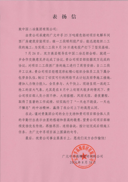 8月30日,四川廣元建筑項(xiàng)目部收到廣元中孚高精鋁材有限公司表揚(yáng)信,對(duì)中國二冶及項(xiàng)目部的精心組織、辛勤付出表示由衷感謝和崇高敬意。