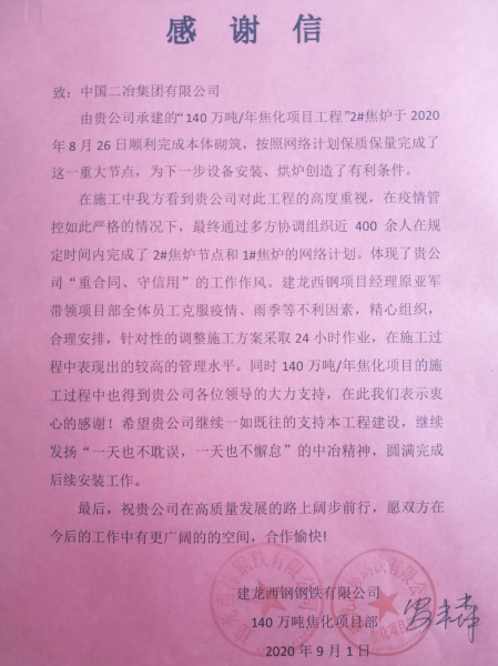 9月1日,業(yè)主單位建龍西鋼鋼鐵有限公司發(fā)來(lái)感謝信,對(duì)中國(guó)二冶集團(tuán)山東區(qū)域分公司承建的建龍西鋼140萬(wàn)噸/年焦化項(xiàng)目工程如期完成2#焦?fàn)t本體砌筑,保證后續(xù)施工的順利開(kāi)展表示衷心感謝。