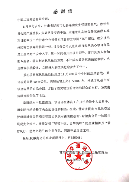 10月26日,甘肅省隴南市禮縣交通運(yùn)輸局發(fā)來感謝信,對(duì)中國(guó)二冶集團(tuán)甘肅分公司景禮項(xiàng)目部在抗洪救災(zāi)活動(dòng)中做出的突出貢獻(xiàn)表示衷心感謝。