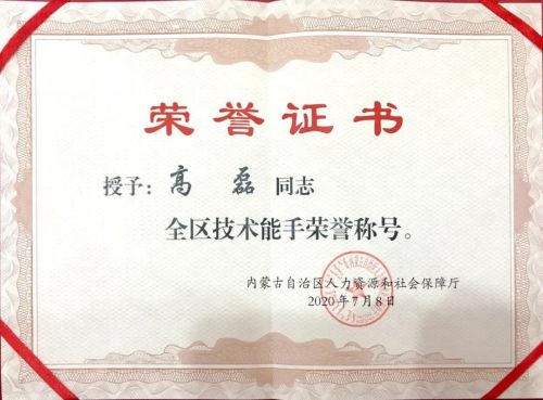 高磊榮獲2020年內(nèi)蒙古自治區(qū)“全區(qū)技術能手”