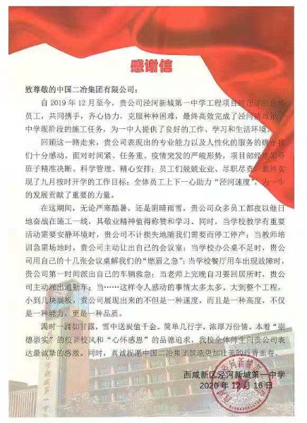 涇河新城第一中學是一所由西安中學進行委托管理的高標準、高質量的完全中學,學校主要負責人及相關領導參與過多個學校建設與驗收工作,他們在感謝信中對中國二冶集團表現出的專業(yè)能力以及人性化的服務進行了高度評價。
