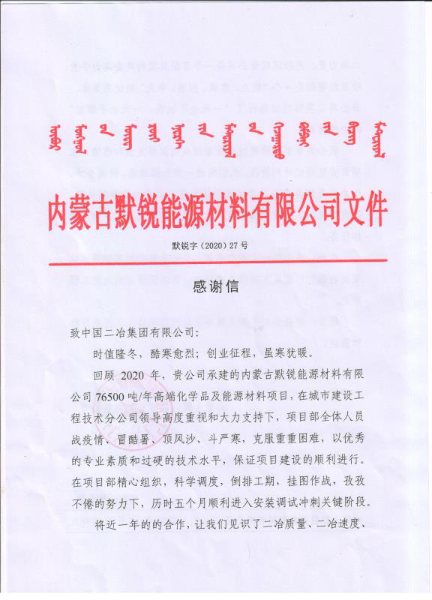 感謝信中指出:回顧2020年,貴公司承建的內(nèi)蒙古默銳能源材料有限公司76500噸電/年高端化學(xué)品及能源材料項目,在中國二冶集團及城市建設(shè)工程技術(shù)公司領(lǐng)導(dǎo)高度重視和大力支持下,項目部全體人員戰(zhàn)疫情、冒酷暑、頂風(fēng)沙、斗嚴寒,克服重重困難,以優(yōu)秀的專業(yè)素質(zhì)和過硬的技術(shù)水平,保證項目建設(shè)的順利進行。在項目部精心組織、科學(xué)調(diào)度、倒排工期、掛圖作戰(zhàn),孜孜不倦的努力下,歷時五個月順利進入安裝調(diào)試沖刺關(guān)鍵階段。將近一年的合作,讓我們見識了二冶質(zhì)量、二冶速度、二冶力量,充分證明貴公司是一個名副其實的央企實力企業(yè)。項目經(jīng)理部是一個“敬業(yè)、忠誠、擔(dān)當、爭先”的優(yōu)秀集體。我公司非常珍惜通過合作凝結(jié)成的深厚友誼和感情,在項目安裝調(diào)試沖刺關(guān)鍵階段,我們將進一步加強溝通、精誠合作,全力以赴配合貴公司項目部全體人員,以更加飽滿的熱情,高質(zhì)量完成工程及設(shè)備安裝調(diào)試,圓滿實現(xiàn)試產(chǎn)投產(chǎn)預(yù)定目標任務(wù),并向中國二冶所有參建人員表示衷心的感謝和崇高敬意!