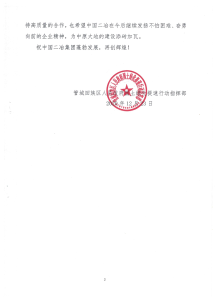 表揚信中,對中國二冶給予該項目的高度重視表示感謝,對于選派的項目團隊、先進的施工理念、優(yōu)質的施工服務給予了高度贊揚。對于項目部自6月份中標后進駐施工現(xiàn)場以來,面對施工區(qū)域規(guī)劃不完善、工期緊、涉及專業(yè)多、協(xié)調部門多等諸多不利因素,公司領導多次深入施工現(xiàn)場指導工作,積極協(xié)調各方、解決技術難題,項目團隊精心組織,加班加點,發(fā)揚了“堅韌不拔,勇攀高峰”的企業(yè)精神,圓滿完成了2020年既定的施工生產(chǎn)任務,對于項目部的高效優(yōu)質的服務意識給予了充分肯定,同時希望中國二冶要繼續(xù)關心、關注項目的后續(xù)建設任務,希望項目團隊要繼續(xù)發(fā)揚優(yōu)良的工作作風,圓滿完成項目的后續(xù)施工任務。