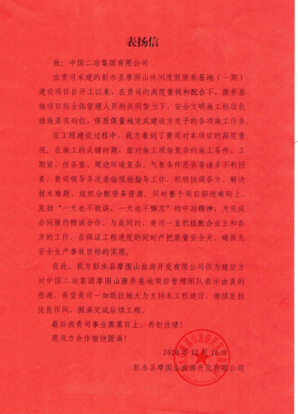 12月26日,內(nèi)蒙古分公司重慶市彭水縣摩圍山休閑度假康養(yǎng)基地(一期)建設項目經(jīng)理部收到彭水縣摩圍山旅游開發(fā)有限公司表揚信,對中國二冶集團內(nèi)蒙古分公司在項目建設中充分履行央企責任,在項目工程建設中發(fā)揮重要作用,彰顯央企實力與擔當給予高度贊揚。