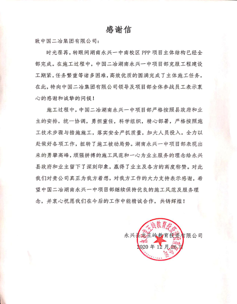 12月26日,湖南省郴州市永興縣龍王嶺教育投資有限公司向中國二冶集團發(fā)來感謝信,對中國二冶鋼構公司永興一中南校區(qū)項目部在施工過程中充分履行央企責任予以高度評價和感謝。