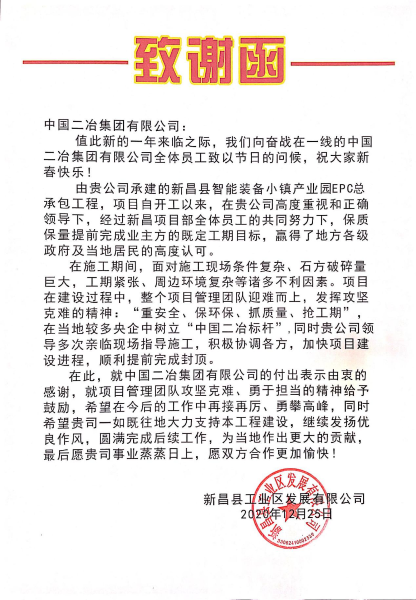 12月28日,路橋公司收到新昌縣工業(yè)區(qū)發(fā)展有限公司發(fā)來的致謝函,對中國二冶承建的新昌縣智能裝備小鎮(zhèn)產(chǎn)業(yè)園EPC總承包工程中的付出表示感謝。