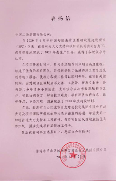 12月29日,市政公司收到臨沂市蘭山區(qū)城市開發(fā)建設投資集團有限公司發(fā)來的表揚信,對由中國二冶承建的山東臨沂國際陸港片區(qū)基礎設施項目部保質保量完成2020年各項施工生產(chǎn)任務給予了充分的認可。
