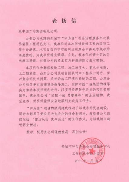 1月12日至13日,中國二冶集團連續(xù)收到兩封表揚信,對中國二冶集團先后在鄒城市“和為貴”社會治理服務(wù)中心裝飾裝修工程項目、鄒城市利民交通工程項目中的出色表現(xiàn)表示肯定,對項目團隊的拼搏奉獻,圓滿完成施工任務(wù)給予高度評價。