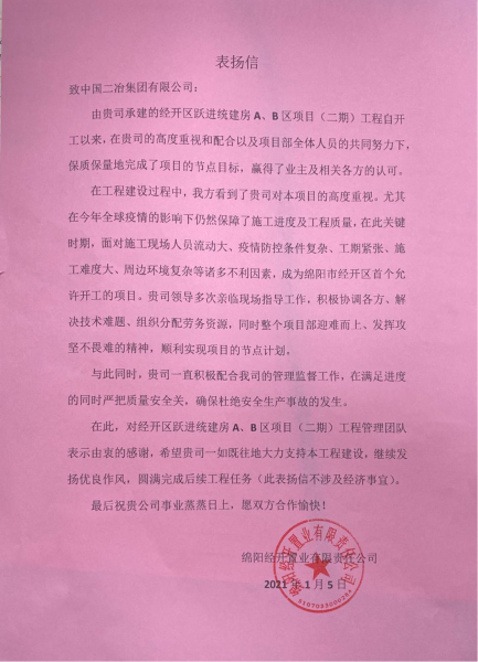 1月18日,業(yè)主單位綿陽經(jīng)開置業(yè)有限責(zé)任公司發(fā)來表揚(yáng)信,對(duì)中國(guó)二冶承建的經(jīng)開區(qū)南區(qū)花園躍進(jìn)統(tǒng)建房A、B區(qū)項(xiàng)目(二期)工程如期完成主體結(jié)構(gòu)全部封頂,保證了后續(xù)施工的順利開展表示衷心的感謝。