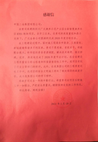 1月22日,四川分公司廣元康養(yǎng)示范產(chǎn)業(yè)園項(xiàng)目部收到廣元金泰半山房地產(chǎn)開發(fā)有限公司發(fā)來的感謝信,對(duì)中國(guó)二冶精心組織施工和項(xiàng)目部全體員工的辛勤付出表示由衷感謝和崇高敬意。