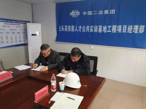 會(huì)上,包頭市人社局技能鑒定指導(dǎo)中心主任朝格圖與中國(guó)二冶包頭市實(shí)訓(xùn)基地項(xiàng)目部項(xiàng)目經(jīng)理萬(wàn)逸男代表雙方簽訂《安全質(zhì)量責(zé)任書》。