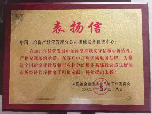表揚信指出:中國二冶資產(chǎn)公司機械設(shè)備租賃中心在2021年經(jīng)營發(fā)展中始終堅持“誠實守信 合作共贏”核心價值觀,嚴(yán)格兌現(xiàn)履約承諾,在客戶中打響優(yōu)質(zhì)服務(wù)品牌,為推動全國冶金建設(shè)吊裝行業(yè)社會信用體系建設(shè)、營造良好市場經(jīng)濟秩序做出了積極貢獻(xiàn)。