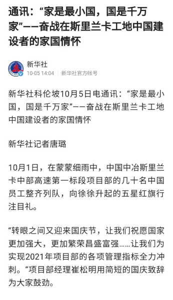 10月5日,新華社以《“家是最小國,國是千萬家”——奮戰(zhàn)在斯里蘭卡工地中國建設者的家國情懷》為題對中國中冶斯里蘭卡中部高速第一標段項目部進行特別報道。項目工作人員在采訪中表示,“家是最小國,國是千萬家”,作為在海外參與“一帶一路”項目的建設者,我們懷有一種使命感和責任感,盡管有時需要為此作出個人犧牲。當看到通過自己的努力,斯里蘭卡基礎設施日新月異、旅游業(yè)蓬勃發(fā)展,我們感到由衷高興和自豪。