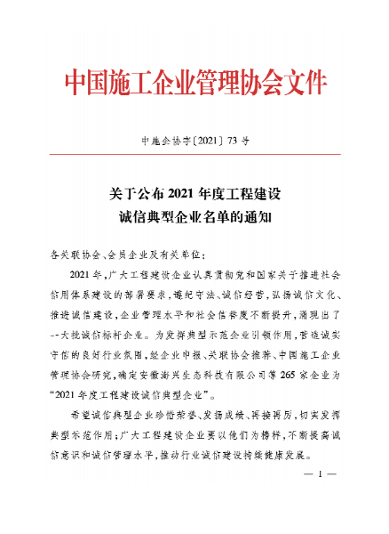 10月28日,由中國施工企業(yè)管理協(xié)會主辦的2021年度工程建設(shè)企業(yè)信用評價結(jié)果及誠信企業(yè)評選揭曉,中國二冶通過AAA信用等級年審并被授予“2021年度工程建設(shè)誠信典型企業(yè)”。