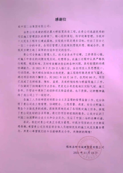 11月19日,錫林浩特市城建投資有限公司發(fā)來感謝信,對(duì)中國(guó)二冶在錫林浩特市那達(dá)慕大橋拓寬改造工程中良好的履約精神給予高度認(rèn)可,對(duì)參與項(xiàng)目建設(shè)的全體人員付出的努力和汗水表示感謝。