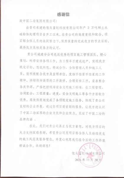 11月22日,業(yè)主方為中國二冶城建分公司承建的包頭堇創(chuàng)科技有限公司年產(chǎn)2萬噸稀土永磁粉體處理項目送來一封沉甸甸的感謝信,感謝中國二冶圓滿完成包頭堇創(chuàng)項目各項工作。