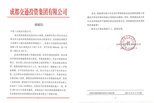 12月17日,成都交通投資集團(tuán)有限公司致中國(guó)二冶表?yè)P(yáng)信,對(duì)中國(guó)二冶四川分公司在成龍簡(jiǎn)快速路工程項(xiàng)目施工建設(shè)中,攻堅(jiān)克難、頑強(qiáng)奮戰(zhàn),優(yōu)質(zhì)、安全、高效地完成施工建設(shè)任務(wù),順利實(shí)現(xiàn)快速路主體工程全線貫通給予表?yè)P(yáng)。
