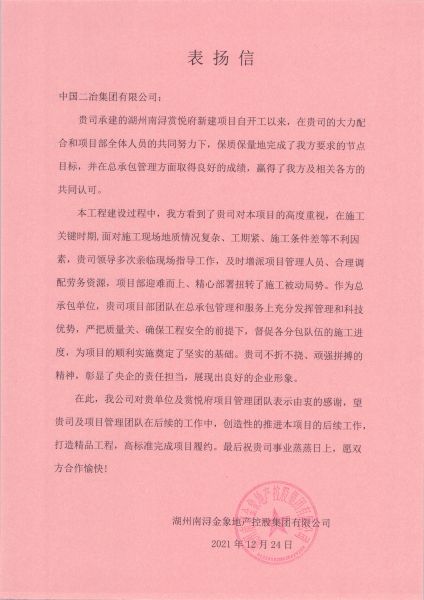 12月28日,湖州南潯金象地產(chǎn)控股集團有限公司致中國二冶表揚信。信中對中國二冶路橋分公司南潯賞悅府住宅小區(qū)新建工程項目部夜以繼日、靶向管理、有序施工,保質(zhì)保量地完成業(yè)主方要求節(jié)點目標,用實際行動闡釋工程建設高效履約表示高度贊揚。