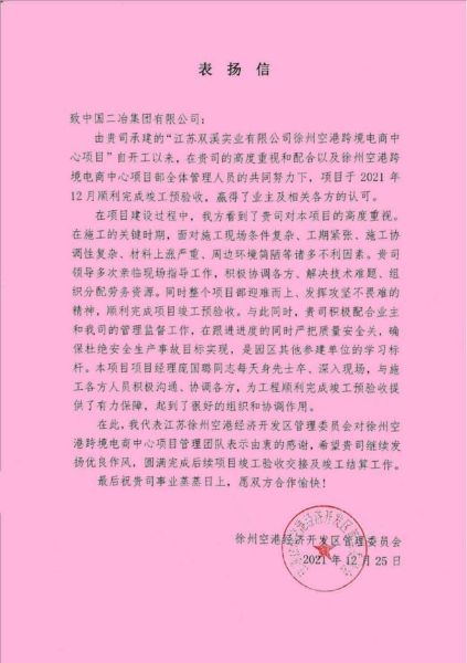 12月30日,中國二冶收到徐州空港經(jīng)濟開發(fā)區(qū)管委會表揚信,對項目于12月25日順利完成竣工預驗收給予表揚,對中國二冶徐州空港跨境電商中心項目管理團隊表示由衷的感謝。信中寫到,在項目建設(shè)過程中,我方看到了貴司對本項目的高度重視. 在施工的關(guān)鍵時期,面對施工現(xiàn)場條件復雜、工期緊張、施工協(xié)調(diào)性復雜、材料上漲嚴重、周邊環(huán)境簡陋等諸多不利因素,貴司領(lǐng)導多次親臨現(xiàn)場指導工作,積極協(xié)調(diào)各方、解決技術(shù)難題。同時整個項目團隊迎難而上、發(fā)揮攻堅不畏難的精神,順利完成項目竣工預驗收,是園區(qū)其他參建單位的學習標桿。