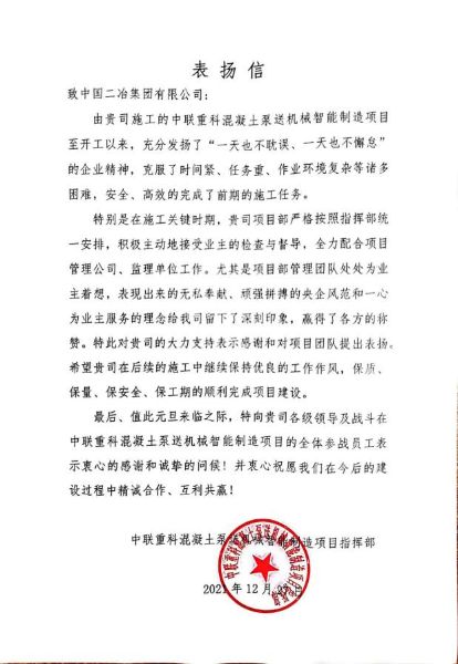 近日,中國二冶連續(xù)收到中聯(lián)重科混凝土泵送機械智能制造項目指揮部和徐州空港經(jīng)濟開發(fā)區(qū)管委會發(fā)來的表揚信。