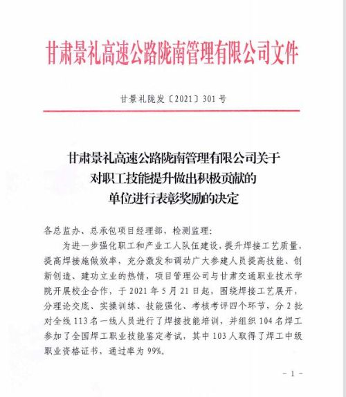 為進(jìn)一步強(qiáng)化職工和產(chǎn)業(yè)工人隊(duì)伍建設(shè),提升焊接工藝質(zhì)量,提高焊接施做效率,充分激發(fā)和調(diào)動(dòng)廣大參建人員提高技能、創(chuàng)新創(chuàng)造、建功立業(yè)的熱情,從2021年5月21日起,甘肅景禮高速公路隴南管理有限公司與甘肅交通職業(yè)技術(shù)學(xué)院開(kāi)展校企合作,圍繞焊接工藝展開(kāi),分理論交底、實(shí)操訓(xùn)練、技能強(qiáng)化、考核考評(píng)四個(gè)環(huán)節(jié),分批次對(duì)全線113名一線人員進(jìn)行了焊接技能培訓(xùn),并組織104名焊工參加了全國(guó)焊工職業(yè)技能鑒定考試,其中103人取得了焊工中級(jí)職業(yè)資格證書(shū),通過(guò)率為99%。