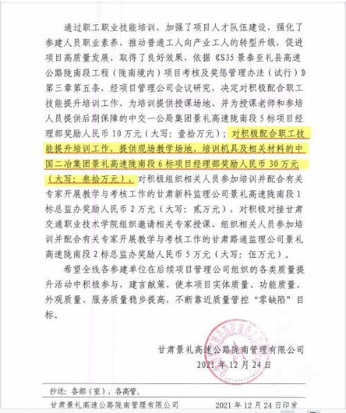 12月29日,中國(guó)二冶景禮項(xiàng)目部在甘肅景禮高速公路隴南管理有限公司組織的職工技能提升活動(dòng)中,做出突出貢獻(xiàn),受到項(xiàng)目管理公司嘉獎(jiǎng)30萬(wàn)元。