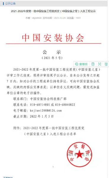 12月29日,中國安裝協(xié)會公布了2021--2022年度第一批中國安裝工程優(yōu)質(zhì)獎(中國安裝之星)獎。中國二冶內(nèi)蒙古達(dá)拉特旗90萬噸/年鋁板帶項目獲得(中國安裝之星)獎。